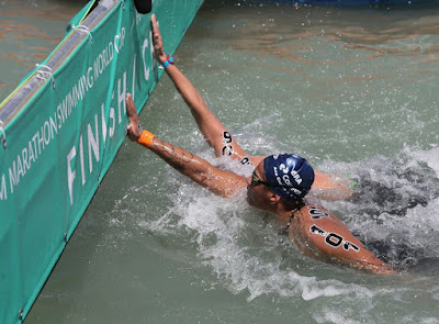 Ana Marcela Cunha (Unisanta) chegou perto do pódio no seu último ensaio para os JOGOS OLÍMPICOS RIO 2016, em Balafonfured (HUN), em prova que valeu pela terceira etapa da COPA DO MUNDO RIO 2016. Na verdade, foi por 11 centésimos. Em prova vencida pela cada vez mais favorita ao ouro em Copacabana Rachele Bruni (ITA, 1:59:58.01), seguida de outra "perigosa inimiga", Haley Anderson (EUA, 2:00:09.81), Ana e Isabelle Harle (ALE) quase chegaram juntas ao terceiro posto, mas, após muita revisão, os juízes chegaram à conclusão, e pela foto acima estavam certos, de que a alemã, também garantida nos Jogos, bateu antes de Ana (2:00:11.54 a 2:00:11.62). No clima da final da NBA, foi uma espécie de toco que Harle deu na baiana. A outra brasileira e outra garantida nos Jogos, Poliana Okimoto (Unisanta), também foi superada em batida de mão por Anna Olasz (HUN): 2:00:13.27 a 2:00:13.51. "Mas que resultado terrível para as brasileiras, vão perder o ouro, que vergonha, etc.", dirão alguns. Mas é bom deixar claro: foi apenas um E-N-S-A-I-O, um treino, e as duas já disseram que a prioridade é mesmo a Olimpíada.